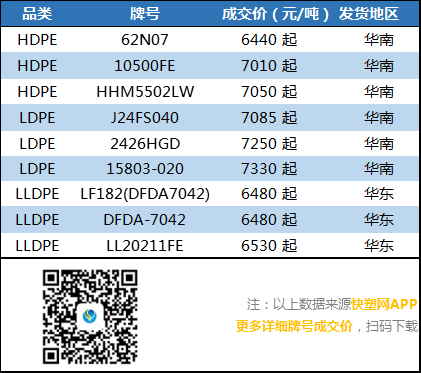 今日PE现货市场报价窄幅震荡。原油及乙烯成本支撑偏强,石化延续去库操作,不过下游刚性需求利好不足,难以刺激现货上涨,市场成交气氛一般。其中华北市场LLDPE主流报6500-6550元/吨,LDPE主流报7400-7500元/吨,HDPE拉丝主流7200-7300元/吨;华东市场LLDPE主流报6500-6600元/吨,LDPE主流报7400-7500元/吨,HDPE拉丝主流报7250-7300元/吨;华南市场LLDPE主流报6800-6900元/吨,LDPE主流报7400-7500元/吨,HDPE拉丝主流报7400-7500元/吨。
