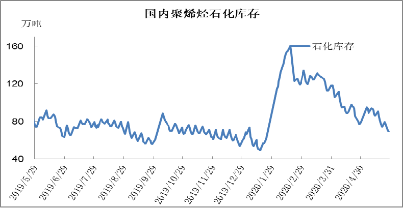 本周石化去库存再次提速,周初在79万吨,周五降至69万吨,再次创出春节后新低。口罩成为前期去库主要驱动,近期虽然有所降温,但是仍有一定刚需。汽车家电等行业回暖,加上检修装置较多,石化去库存稳步进行。