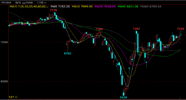 本周PP期货继续宽幅震荡,虽然再次上冲7300大关但再次失败。本周PP多空交织下宽幅震荡,苏日安五日支撑较强,但是上冲7300失败,显示此处极强的阻力位。后期若跌破五日均线或能重拾跌势,否则PP将继续震荡。