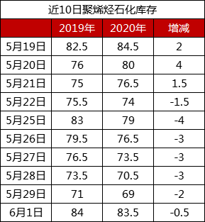 分析:周末累库后周初石化库存反弹至83.5万吨,较上周五增加14.5万吨,与去年同期基本持平。前期口罩需求大幅增加,极大消化了石化库存,近期虽然口罩降温,但是家电汽车等行业回暖,对库存仍有一定消化。目前石化检修较多,但是新装置投产压力大,加之PP及PE传统下游需求偏弱,预期后期去库存缓慢进行。