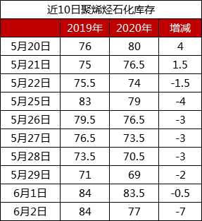 分析:周末累库后周初石化库存反弹至80万吨以上,周二下降5.5万吨至77万吨,较去年同期低7万吨左右。前期口罩需求大幅增加,极大消化了石化库存,近期虽然口罩降温,但是家电汽车等行业回暖,对库存仍有一定消化,加之近期市场行情偏强,成交较好。目前石化检修较多,但是新装置投产压力大,加之PP及PE传统下游需求偏弱,预期二者抵消后石化去库稳步进行。