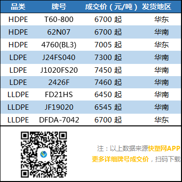 今日PE现货市场报价窄幅震荡。尽管国际油价回调,但是石化维持去库操作,现货供应压力不大,尤其是出厂价跌幅有限,抑制现货市场跌势,不过下游刚性需求一般,市场高价成交气氛清淡。其中华北市场LLDPE主流6600-6700元/吨,LDPE主流报7700-7800元/吨,HDPE拉丝主流7500-7600元/吨;华东市场LLDPE主流报6700-6800元/吨,LDPE主流报7800-7900元/吨,HDPE拉丝主流报7600-7700元/吨;华南市场LLDPE主流报6800-7000元/吨,LDPE主流报7700-7900元/吨,HDPE拉丝主流报7600-7700元/吨。