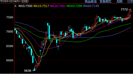 今天PP期货宽幅震荡,盘中一度大涨,再次逼近前高附近,但是并未有效突破,回吐部分涨幅。目前全球金融市场做多热情高涨,PP突破上限,均线发散向上,持仓及成交明显增加,多头市场明显,预计近期继续冲高,关注前高及8000点附近阻力情况。
