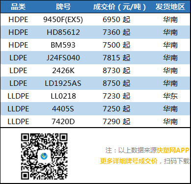 今天PE市场报价弱势震荡,石化部分检修装置开车,而新增检修减少,供应利好下降,石化出厂价出现松动,进口集中到港,供应及成本利好支撑下降,现货市场出现小幅倒挂。其中华北市场LLDPE主流7300-7350元/吨,LDPE主流报8900-9000元/吨,HDPE拉丝主流8300-8400元/吨;华东市场LLDPE主流报7300-7400元/吨,LDPE主流报9000-9100元/吨,HDPE拉丝主流报8300-8400元/吨;华南市场LLDPE主流报7450-7550元/吨,LDPE主流报8900-9000元/吨,HDPE拉丝主流报8400-8500元/吨。