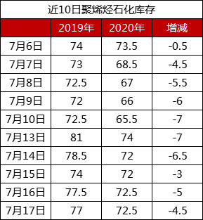 分析:周五石化库存72.5万吨,与昨天持平,较去年同期低4.5万吨。本周石化去库存速度明显放缓,周内仅仅去库1.5万吨,远低于正常水平。目前依然处于需求淡季,除抗洪塑编袋等个别行业需求较好外,多数传统下游偏弱;检修利好仍在但接近尾声,后期新装置扩能压力较大,预计后期石化去库存难度依然较大。