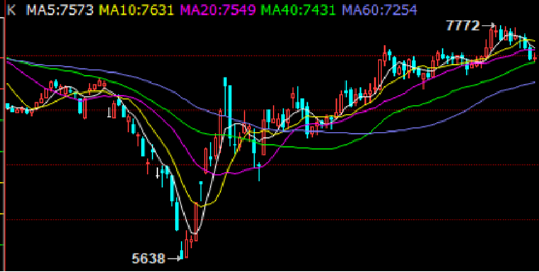 本周PP主力09明显回落。前期多次上冲7770附近前高受阻后多头止赢离场,市场缺乏上冲动能;本周日线全面下跌,跌破多条均线支撑,五日均线掉头向下,KDJ及MACD等技术指标转空,目前市场进入空头走势,下方仍有一定补跌空间。