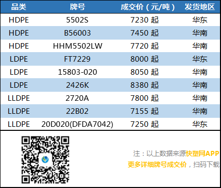 今日PE市场报价继续下跌,石化检修装置陆续开车,货源供应上升,尤其是进口远洋货集中到港,成本偏低,拖累石化降价,供应及成本利好支撑下降,贸易商降价出货。其中华北市场LLDPE主流7050-7150元/吨,LDPE主流报8500-8600元/吨,HDPE拉丝主流8000-8100元/吨;华东市场LLDPE主流报7100-7150元/吨,LDPE主流报8500-8700元/吨,HDPE拉丝主流报8200-8300元/吨;华南市场LLDPE主流报7200-7300元/吨,LDPE主流报8200-8600元/吨,HDPE拉丝主流报8400-8500元/吨。