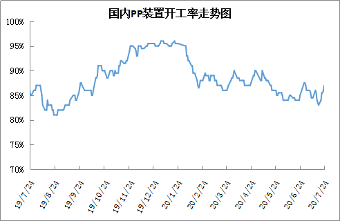 近期PP开工率明显提升,已经站上85%大关。本周暂无新增加检修装置,但是中沙天津、中天合创、荆门石化、大唐多伦等装置陆续重启开工,PP开工率目前已经涨至87%附近;下周东莞巨正源、宁夏宝丰有重启计划,大唐多伦及中原石化有检修计划,预计PP开工率有望继续回升。