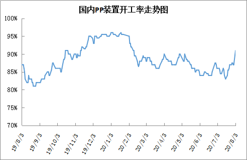 周末延长中煤榆林、中煤榆林及宁夏宝丰等装置重启,PP开工率大幅提升,目前已经突破90%大关,PP日度产量达到6.57万吨,创历史新高。目前PP检修利好明显减弱,后期开工率有望继续走高,且随着新装置陆续投产,产能基数增大,后期供应压力逐渐加大。
