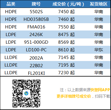 今日PE市场上涨50-100,期货大涨超2%,刺激贸易商高报出货,不过石化供应上升,现货供应偏宽松,下游购买积极性一般,抑制现货市场涨幅。其中华北市场LLDPE主流7200-7250元/吨,LDPE主流报8700-8800元/吨,HDPE拉丝主流8100-8200元/吨;华东市场LLDPE主流报7250-7300元/吨,LDPE主流报8700-8800元/吨,HDPE拉丝主流报8200-8300元/吨;华南市场LLDPE主流报7250-7300元/吨,LDPE主流报8500-8600元/吨,HDPE拉丝主流报8400-8500元/吨。