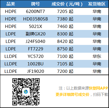 今日PE市场上涨50-200,期货夜盘升水现货刺激石化涨价,贸易商高报出货,不过石化供应上升,现货供应偏宽松,下游购买积极性一般,抑制现货市场涨幅。其中华北市场LLDPE主流7200-7250元/吨,LDPE主流报8800-8900元/吨,HDPE拉丝主流8100-8200元/吨;华东市场LLDPE主流报7250-7300元/吨,LDPE主流报8800-8900元/吨,HDPE拉丝主流报8200-8300元/吨;华南市场LLDPE主流报7250-7300元/吨,LDPE主流报8500-8600元/吨,HDPE拉丝主流报8400-8500元/吨。
