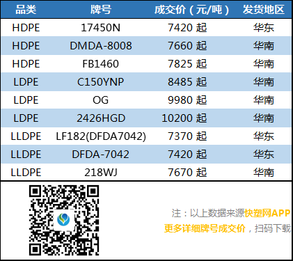 今日PE市场维持下滑行情,周初石化库存上升,出厂价部分下调,打压市场下跌,不够石化出厂价跌幅有限抑制现货跌幅,不过市场成交气氛一般。其中华北市场LLDPE主流7300-7400元/吨,LDPE主流报10000-10100元/吨,HDPE拉丝主流8700-8800元/吨;华东市场LLDPE主流报7400-7500元/吨,LDPE主流报10000-10200元/吨,HDPE拉丝主流报8900-9000元/吨;华南市场LLDPE主流报7700-7800元/吨,LDPE主流报10300-10400元/吨,HDPE拉丝主流报9000-9100元/吨。