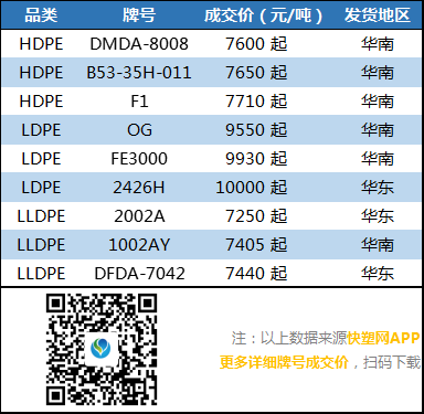 今日PE市场维持下滑行情,石化库存降速放暖,出厂价部分下调,打压市场下跌,主要集中在前期价位偏高的HDPE及LDPE品种,LLDPE由于价位较低,跌幅有限,不过市场成交气氛一般。其中华北市场LLDPE主流7300-7400元/吨,LDPE主流报10000-10100元/吨,HDPE拉丝主流8700-8800元/吨;华东市场LLDPE主流报7400-7500元/吨,LDPE主流报10000-10200元/吨,HDPE拉丝主流报8900-9000元/吨;华南市场LLDPE主流报7700-7800元/吨,LDPE主流报10100-10300元/吨,HDPE拉丝主流报9000-9100元/吨。