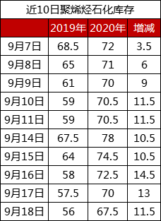 分析:周五石化库存70.5万吨,较昨天下降2.5万吨,较去年同期高11.5万吨。本周石化去库略有加速,下游需求逐渐恢复,叠加阶段性补库,市场成交好转;供应端压力偏大,目前聚烯烃开工率95%以上高位,宝来石化及湛江中科等新装置陆续投产,供应端压力大于需求端恢复情况,虽然需求恢复,但是去库存速度或难以快速去库。