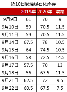 分析:周二石化库存67.5万吨,较昨天下降4.5万吨(昨天修正为72万吨),较去年同期高7.5万吨。近期石化库存去库存速度有所提速,目前维持正常去库水平下游需求逐渐恢复,叠加国庆节提前备货,市场成交好转,不过供应端压力偏大,目前聚烯烃开工率95%以上高位,宝来石化、湛江中科及泉州炼化等新装置陆续投产,虽然需求恢复,但是供应端压力不减,虽然去库维持正常水平,但是速度难以大幅度提速。