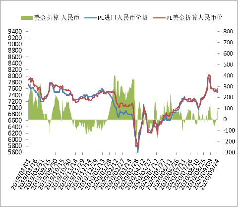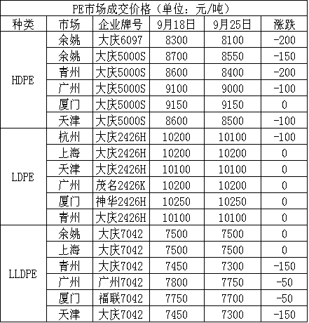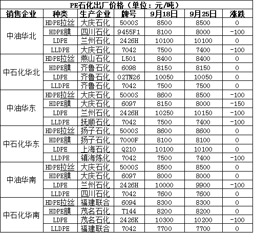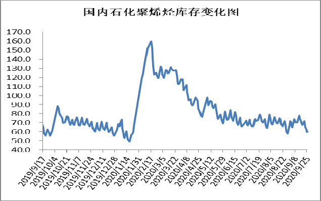 截至9月25日石化聚烯烃库存在59.5万吨,较上周同期减少8万吨,与去年同期持平,下游刚性需求仍有利好支撑,不过国际油价及期货走跌,打压买家购买积极性,石化降价去库存,虽然石化供应上升,但是临近月底,受考核影响,预计石化将维持去库存操作,国庆假期大概率累库。
