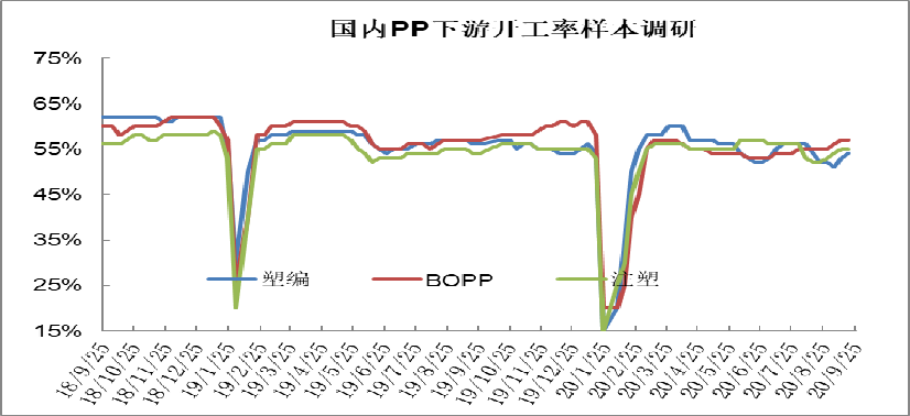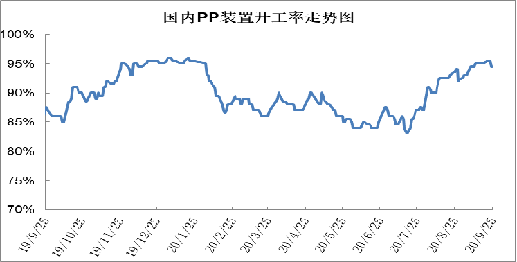 本周PP开工率虽然小幅下降,但依然处于绝对值高位。本周大唐多伦二线及巨正源一线临时检修,开工率一度下行,但是巨正源即将重启,减少检修随时量,目前PP开工率依然接近95%。新装置方面宝来稳定生产,中科炼化故障推迟开工,泉州二期试车出料,后期供应压力渐增。