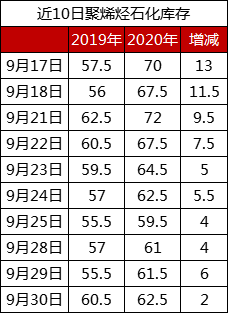 分析:周三石化库存62.5万吨,较昨天增加1万吨,较去年同期高2万吨。近期石化去库明显,主要得益于新装置尚未稳定量产,而需求启动明显,加之国庆节备货增多,石化去库效果显著。不过国庆节即将到来,节前备货基本完成,PP开工率居高不下,石化开始小幅累库。国庆节石化势必累库,节后新装置陆续投产,预计节后去库压力较大。