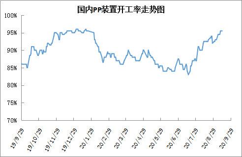 8月中下旬开始PP开工率明显反弹,9月之后开工率继续走高,目前已经站上95%大关,触及近三年来高点。目前PP正常检修装置仅剩下中原石化及锦西石化,大唐多伦及大庆石化为临时检修。后期PP计划内检修仅剩下两套装置且产能较小,后期PP开工率有望继续走高且维持高开工率。