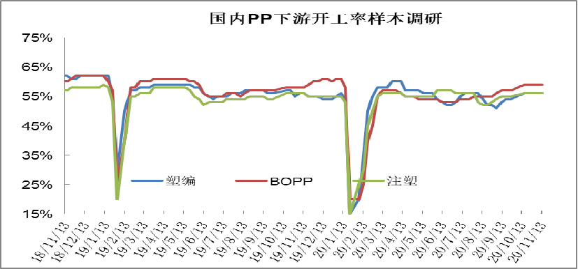 本周国际油价冲高回落。周初受美国大选及疫苗研发取的突破性进展影响,乐观情绪释放,加之欧佩克有意延长减产协议,油价一度暴涨,周中油价回落,但是依然在40美元上方。油价大涨后PP成本有所提高,目前PP利润在2500元/吨左右,较前期已经有极大修复,但是整体依然处于偏高态势。