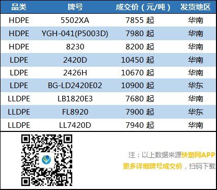 PE现货市场报价上涨50-100,尽管下跌,但是期货上涨超2%,提振现货市场心态,刺激贸易商高报出货,不过石化出厂价涨幅有限,抑制现货市场涨幅。其中华北市场LLDPE主流7500-7600元/吨,LDPE主流报10400-10500元/吨,HDPE拉丝主流8200-8300元/吨;华东市场LLDPE主流报7600-7700元/吨,LDPE主流报10300-10500元/吨,HDPE拉丝主流报8400-8500元/吨;华南市场LLDPE主流报7800-7900元/吨,LDPE主流报10500-10700元/吨,HDPE拉丝主流报8600-8700元/吨。