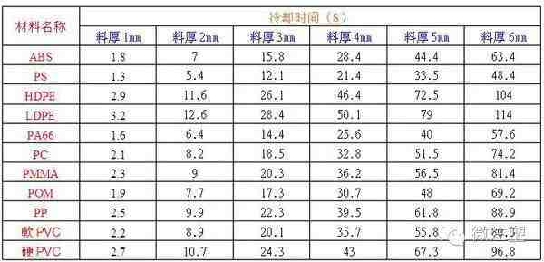 冷却时间指保压结束到开启模具所经历的时间。冷却时间的长短受制品形状、壁厚,模具冷却水的设计、模具温度、熔体的性质等因素的影响。在保证取得较好制件质量前提下,应当尽量缩短冷却时间。当制品一定时,模具冷却水的设计是影响冷却时间长短的关键因素。冷却时间见下表: