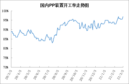 本周PP开工率继续走高,截至周五开工率已经攀升至97.5%,为近五年来最高点。由于目前PP生产企业利润丰厚,PP开工率偏高,检修装置较少,近期济南炼厂、宁夏石化、扬子石化等装置检修,但是蒲城能源、钦州石化等重启,且宁夏等装置为临时检修,PP开工率不降反升。不过下月开始PP进入常规检修期,PP开工率有望明显回落,届时供应压力有望得到一定缓解。