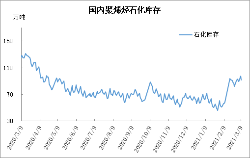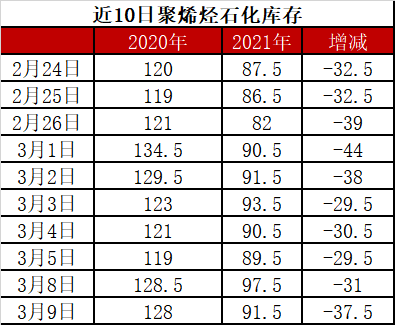 分析:周二石化库存91.5万吨,下降6万吨,较去年同低37.5万吨。上周石化去库明显放缓,主要因为节后下游虽然陆续开工,但是对高价货源比较抵触,采购积极性较差,消化前期备货为主,不过下游原料库存处于低位,刚需下逐渐接受目前原料价格,近期成交明显好转,加之上游即将进入检修期,供应压力有望得到缓解,后期石化去库速度有望提速。