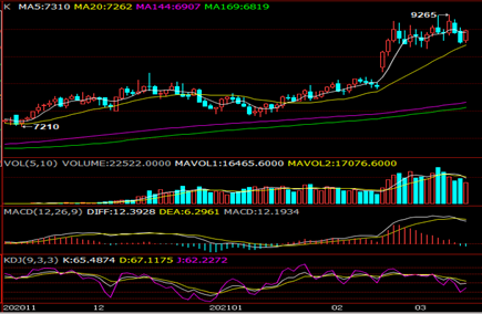 PE期货05合约止跌反弹,KDJ指标拐头向上,不过MACD下跌绿柱并未变短,持仓量下降,成交量下降,部分空头立场,多头同样未有跟进,现货供需预期偏利好,只是当下去库缓慢,关注8700附近支撑,仅供参考。