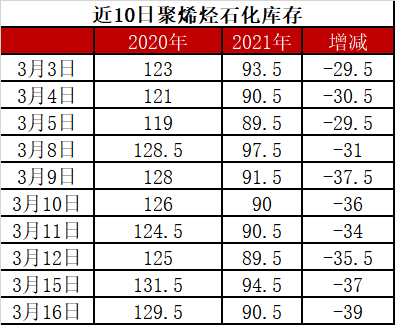 分析:周二石化库存90.5万吨,较昨天下降3万吨(昨天修正为93.5),较去年同低39万吨。春节后石化库存去库明显放缓,近期在90-95万吨之间运行。本周来看,下游需求虽然拿货有所增多,但是并未出现实质性好转,石化去库难度依然较大;不过国外价格依然较高,出口窗口继续打开,上游生产企业也即将进入集中检修,预计近期石化库存有望稳步去库。