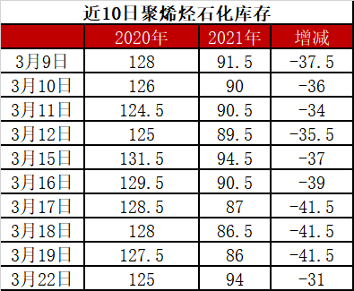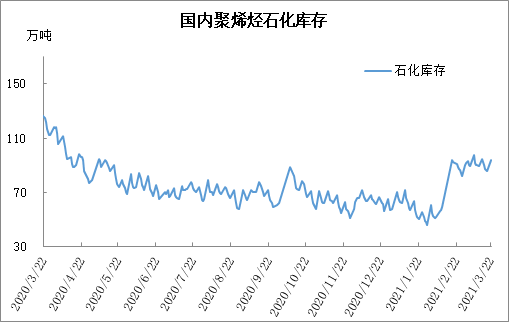 分析:周末累库后石化库存涨至94万吨,较上周末增加8万吨,较去年同期低31万吨。上周石化去库先快后慢,仍未能跌破85万吨大关。目前来看供应端开工率依然偏高,在95%附近,不过后期进入检修季,开工率有望明显缓解;需求端低迷是去库受阻主要原因,目前下游备货不积极,社会库存偏高,后期淡季来临,去库难度更大。后期供应压力有望缓解但是需求难以提振,预期去库难度依然较大。