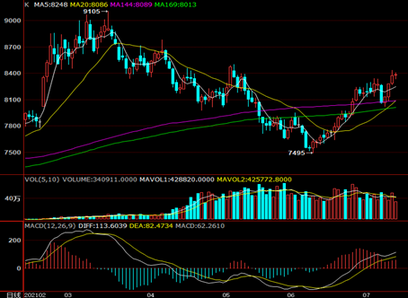 PE期货09合约窄幅震荡并收十字星,KDJ指标向上,MACD上涨红柱变长,持仓量增加,成交量下降,多空分歧明显,煤化工LL利润压缩明显,部分装置停车检修叠加宏观利好消息刺激,期货偏强运行,不过8月中旬起国内PE大修装置减少,新增产能投产,下游整体需求利好改善有限,09合约逢高空思路为主,仅供参考。