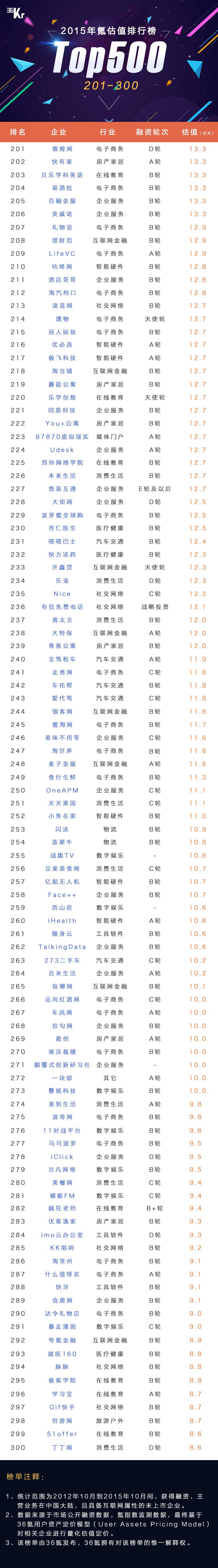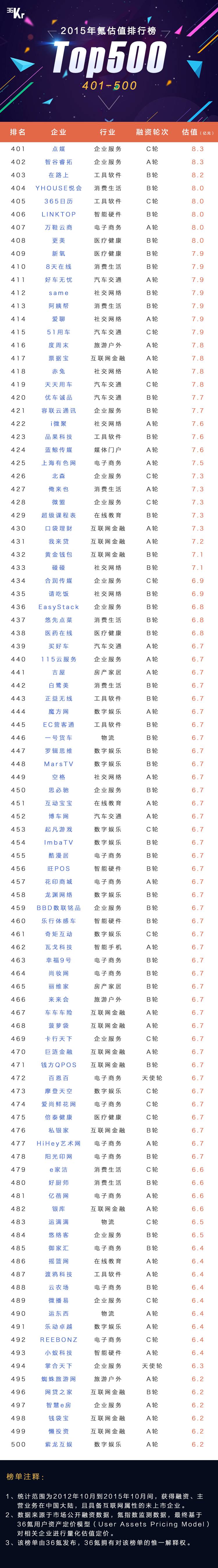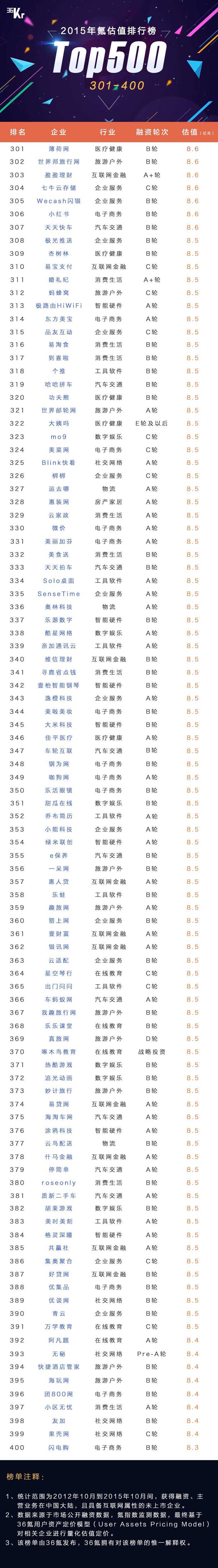 12月8日,36 氪在 WISE 大会上正式发布《2015年 氪估值排行榜 Top500》,这是行业内首份系统性发布的中国创业企业估值榜。