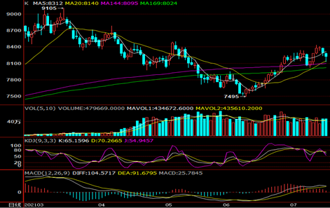 PE期货09合约延续下跌行情,KDJ指标继续向下扩散,MACD上涨红柱变短,持仓量下降,成交量增加,多头力量减弱,8月中旬起国内PE大修装置减少,新增产能投产,下游整体需求利好改善有限,09合约逢高空思路为主,风险主要是煤化工LL成本支撑,仅供参考。