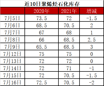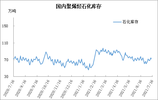 分析:周五石化库存70.5万吨,与昨天持平,较去年同期低2万吨。7月以来石化去库速度明显放缓,已经连续两周周内去库不足5万吨,这也是最近首次出现周五库存70万吨的高位情况。6月底石化半年考核,石化快速去库,石化库存转化为社会库存,7月以来市场消化社会库存为主,去库放缓。基本面来看,虽然近期聚烯烃检修装置较多,但是下游需求一般,且新装置陆续投产,加重去库难度。