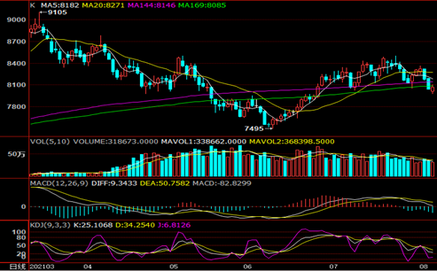 PE期货09合约跌势放缓,KDJ指标拐头向上,MACD下跌绿柱变长,持仓量及成交量同步减少,空头力量部分平仓离场,多头同样跟进乏力,8月中旬起国内PE大修装置减少,尤其是LL供应增加,新增产能,下游整体需求利好改善有限,尤其是近期疫情升级弱化下游需求,预计09合约偏弱运行,仅供参考。
