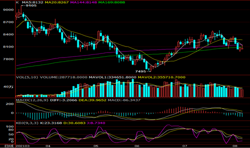 PE期货09合约横盘整理,KDJ指标继续向上,MACD下跌绿柱变短,持仓量及成交量同步减少,多空力量均显不足, 8月中旬起国内PE大修装置减少,尤其是LL供应增加,下游整体需求利好改善有限,尤其是近期疫情升级弱化下游需求,预计09合约偏弱运行,仅供参考。