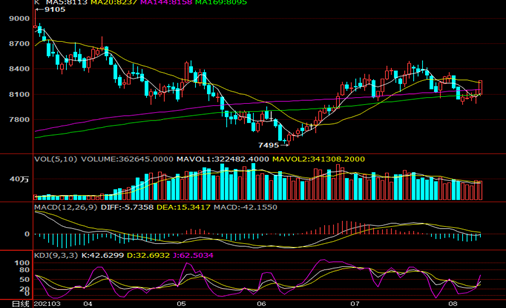 PE期货09合约上涨超2%,KDJ指标金叉后继续向上,MACD下跌绿柱变短,持仓量及成交量同步减少,空头低位平仓离场,多头主动做多动力同样不强, 8月中旬起国内PE大修装置减少,尤其是LL供应增加,下游整体需求利好改善有限,抑制PE期货涨幅,关注疫情好转后需求变化,仅供参考。