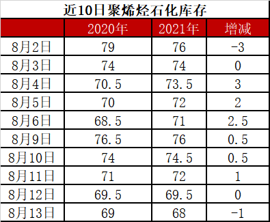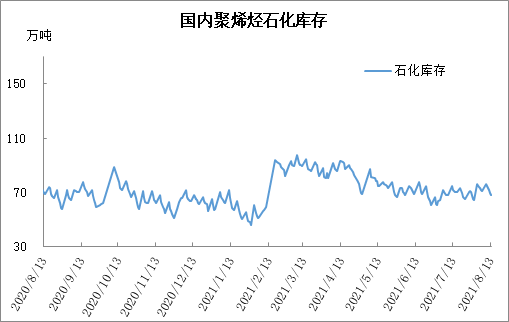 分析:周五石化库存68万吨,较昨天下降1.5万吨,较去年同期低1万吨。8月上旬石化去库明显放缓,不过进入中旬,去库逐渐恢复正常水平,目前已经跌破70万吨大关。目前聚烯烃集中检修进入尾声,供应逐渐恢复正常,新装置面临投产,需求端虽然边际改善,但是暂未进入旺季,在供应增加背景下,后期去库将主要依赖于需求的好转。