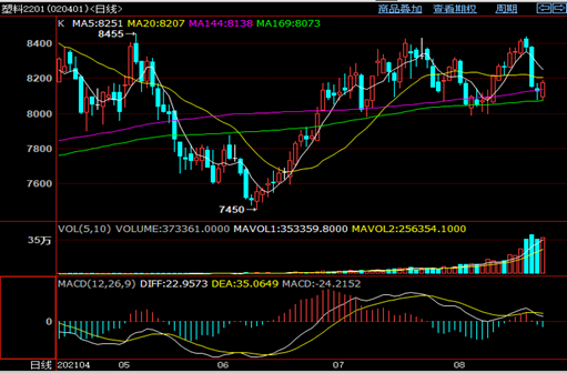 PE期货01合约弱势反弹,KDJ指标继续向下,MACD下跌绿柱变长,持仓量下降,成交量上升,期货下跌动力减弱,尽管国际油价重心下移,8月底开始国内PE大修装置减少,下游整体需求利好改善有限,LL上涨乏力,基差偏弱,不过煤制LL成本支撑较强,下游需求逐步上升,抑制盘面跌幅,关注前低附近支撑,仅供参考。