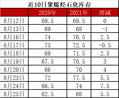分析:周三石化库存68万吨,较昨天下降6万吨,较去年同期高5.5万吨。前期石化去库受阻,连续两周未能跌破70万吨大关,不过本周石化去库明显提速,周中库存已经跌破70万吨大关。目前石化检修力度较大,开工率均在90%以下,下游需求边际改善,近期石化有望维持去库状态。