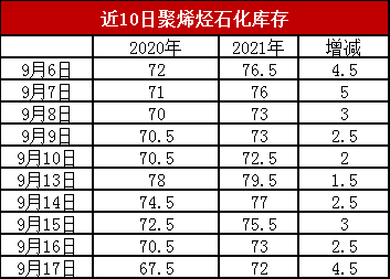 分析:周五石化库存72万吨,较昨天下降1万吨,较去年同期高4万吨。本周石化去库依然难以有效提速,8月份以来仅有一周周末库存跌破70万吨大关,目前石化库存处于历史同期高位水平。目前来看聚烯烃检修力度大于预期,一定程度缓解供应压力,但是需求偏弱,旺季迟迟难以有效启动,成为当下去库最大阻碍。