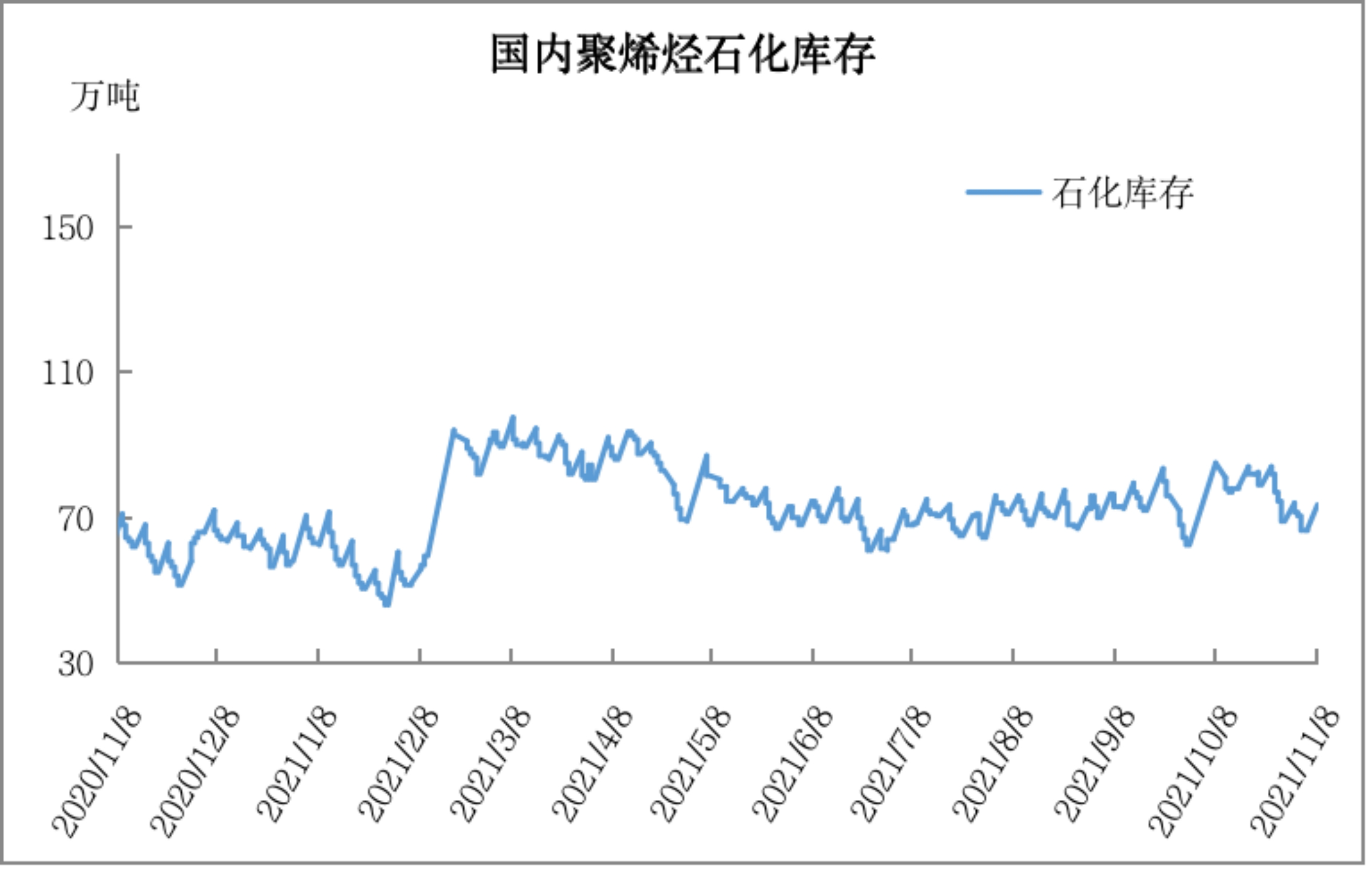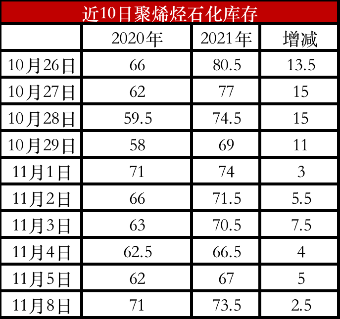 周初石化库存73.5万吨,较上周末增加6.5万吨,较去年同期高2.5万吨。经历了10月份的去库受阻甚至一度累库之后,近期石化去库明显提速。供应端聚烯烃开工率依然低于往年同期,加之新装置投产缓慢,供应压力不大;需求端虽然旺季尾声,但是部分地区限电放松,需求有所改善。近期石化去库提速后库存水平已经基本与去年同期相差不多。