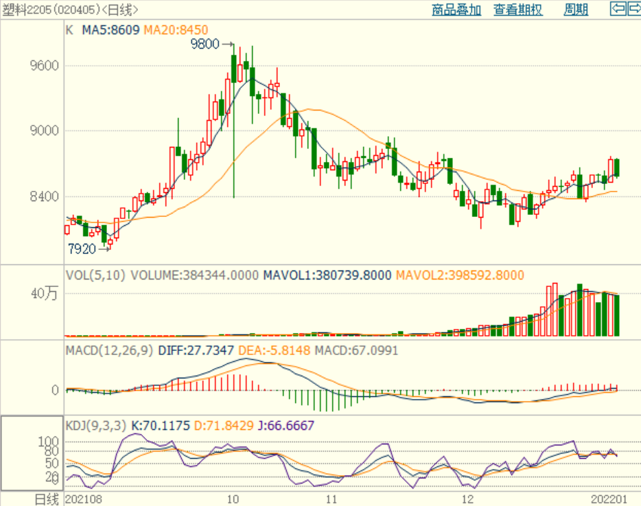 塑料期货05合约震荡下跌,持仓量及成交量下降,KDJ指标拐头向下,MACD上涨红柱变短,尽管国际油价反弹,但是动力煤期货连续下跌,成本支撑不足,国内PE供应上升,下游棚膜生产旺季接近尾声,现货供需利好不足,部分多头获利离场,抑制期货涨幅,仅供参考。