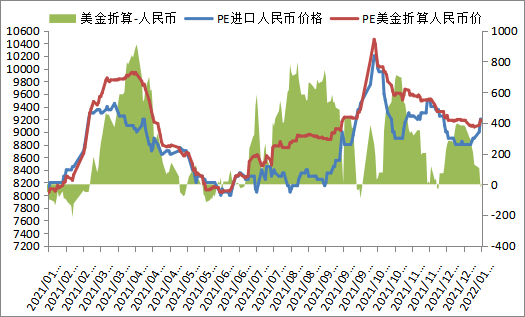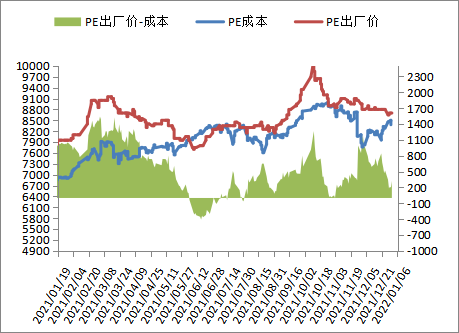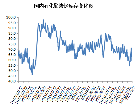 截至1月7日石化聚烯烃库存在59.5万吨,较上周同期增加1.5万吨,与去年同期增加6.5万吨,进口货源冲击压力偏轻,不过下游刚性需求有所减弱,国内PE开工负荷小幅上升,抑制库存降幅,部分转化成贸易商库存。后期国内PE新增大修装置减少,部分检修装置计划开车,冬奥会环保督察,下游需求预期减弱,预计会抑制库存降幅。