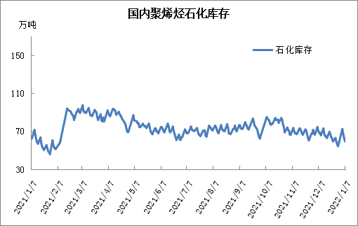 元旦小长假石化库存一度突破70万吨大关,但是随后去库恢复正常,周末跌破60万吨,甚至低于去年同期。近期聚烯烃开工正常,但是新装置投产推迟,供应压力不大,需求虽然有环保限产预期,但是限产在2月份,需求目前维持,库存压力不大,节前下游若能启动备货,库存有望继续维持低位水平。