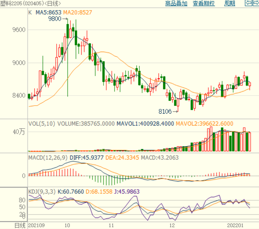塑料期货05合约弱势震荡,持仓量小幅增加,成交量小幅下降,KDJ指标继续向下,MACD上涨红柱变短,国际油价及动力煤期货持续下跌,国内PE供应上升,下游棚膜生产旺季接近尾声,现货供需利好不足,部分多头离场,不过国际油价维持高位,关注8400-8500支撑,仅供参考。