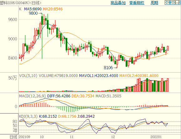 塑料期货05合约反弹超2%,持仓量及成交量增加,KDJ指标拐头向上,MACD上涨红柱变长,国际油价及动力煤期货反弹,成本支撑增强,国内PE供应上升,下游棚膜生产旺季接近尾声,现货供需利好不足,抑制期货涨幅,关注8900附近压力,仅供参考。