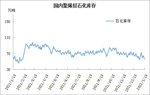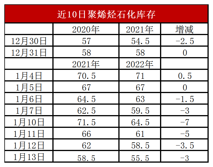 周四石化库存55.5万吨,较昨天下降3万吨,较去年同期低3万吨。21年全年聚烯烃库存远低于预期,不是需求多好,而是主要因为进口减少出口增加。近期聚烯烃开工正常,但是新装置投产推迟,供应压力不大,需求虽然有环保限产预期,但是限产在2月份,需求目前维持,库存压力不大,节前下游若能启动备货,库存有望继续维持低位水平。