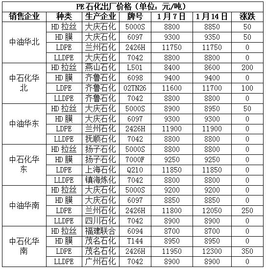 截至1月14日石化聚烯烃库存在52.5万吨,较上周同期下降7万吨,与去年同期增加3.5万吨,进口货源冲击压力偏轻,以及塑料期货持续反弹刺激部分下游春节前补库,不过国内PE开工负荷小幅上升,抑制库存降幅,后期国内PE新增大修装置减少,部分检修装置计划开车,下游工厂陆续放假,抑制库存降幅。